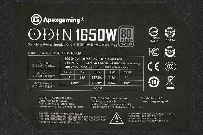 这款奥丁电源符合ATX3.0规范设计,可轻松放入ATX机箱,同时强化供电能力,单路12V输出电流高达70A。内部采用全套日系电容,主电容和固态电容均为日系产品。电源为全模组设计,具备两组原生16pin接口,风扇采用自动启停技术,噪声更低。电源具备12年质保,使用更加安心。充电头网拿到的是1650M型号,即1650W输出功率。下面就带来这款电源的拆解,看看内部用料情况。